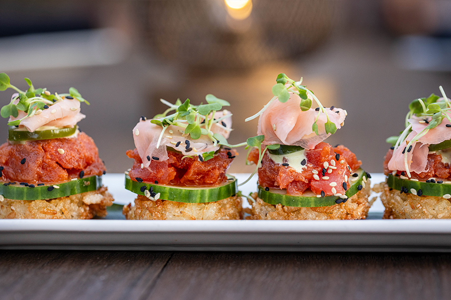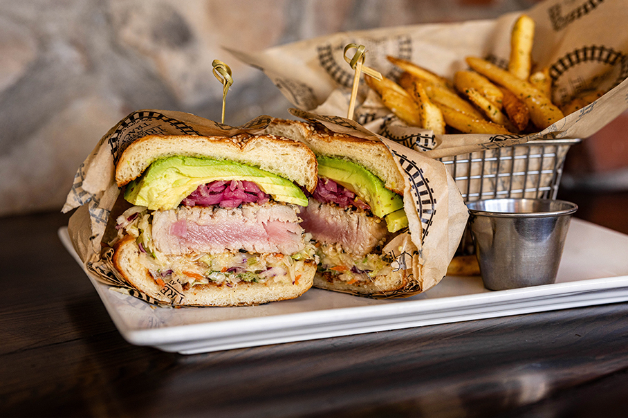 6oz Pepper Crusted Ahi | Local Garden Greens Fresh Cucumber | Red Onion | Avocado Pickled Ginger | Micro Wasabi | Sesame Seeds Lilikoi Dressing | Sriracha Aioli | Sweet Soy